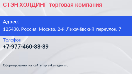СТЭН ХОЛДИНГ, торговая компания по адресу 125438, Россия, Москва, 2-й Лихачёвский переулок, 7 в дальнейшем Организация, размещена в следующих категориях: