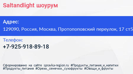 Saltandlight, шоурум по адресу 129090, Россия, Москва, Протопоповский переулок, 17 ст5 в дальнейшем Организация, размещена в следующих категориях: