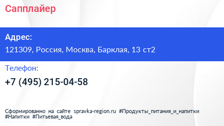 Сапплайер по адресу 121309, Россия, Москва, Барклая, 13 ст2 в дальнейшем Организация, размещена в следующих категориях: