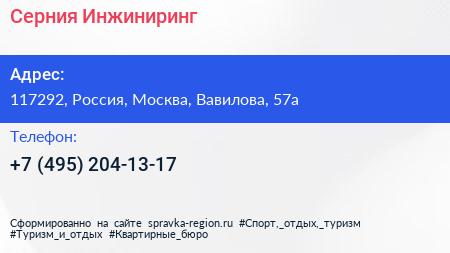 Серния Инжиниринг по адресу 117292, Россия, Москва, Вавилова, 57а в дальнейшем Организация, размещена в следующих категориях:
