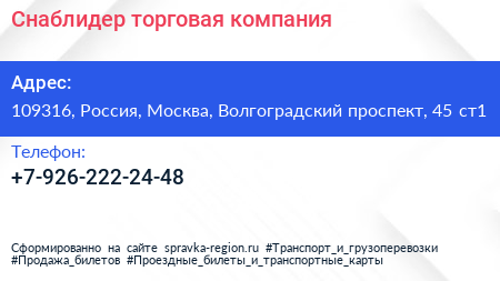Снаблидер, торговая компания по адресу 109316, Россия, Москва, Волгоградский проспект, 45 ст1 в дальнейшем Организация, размещена в следующих категориях: