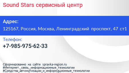 Sound Stars, сервисный центр по адресу 125167, Россия, Москва, Ленинградский проспект, 47 ст1 в дальнейшем Организация, размещена в следующих категориях: