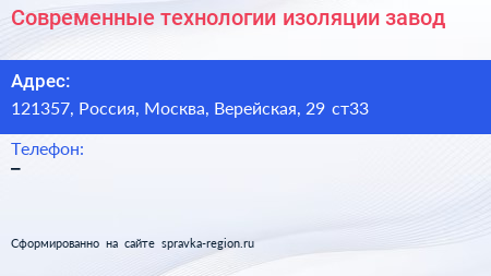 Современные технологии изоляции, завод по адресу 121357, Россия, Москва, Верейская, 29 ст33 в дальнейшем Организация, размещена в следующих категориях: