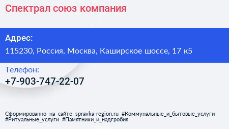 Спектрал союз, компания по адресу 115230, Россия, Москва, Каширское шоссе, 17 к5 в дальнейшем Организация, размещена в следующих категориях: