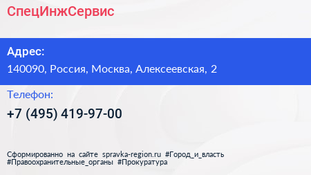 СпецИнжСервис по адресу 140090, Россия, Москва, Алексеевская, 2 в дальнейшем Организация, размещена в следующих категориях: