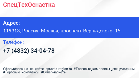 СпецТехОснастка по адресу 119313, Россия, Москва, проспект Вернадского, 15 в дальнейшем Организация, размещена в следующих категориях: