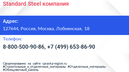 Standard Steel, компания по адресу 127644, Россия, Москва, Лобненская, 18 в дальнейшем Организация, размещена в следующих категориях: