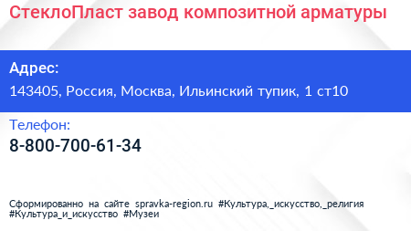 СтеклоПласт, завод композитной арматуры по адресу 143405, Россия, Москва, Ильинский тупик, 1 ст10 в дальнейшем Организация, размещена в следующих категориях: