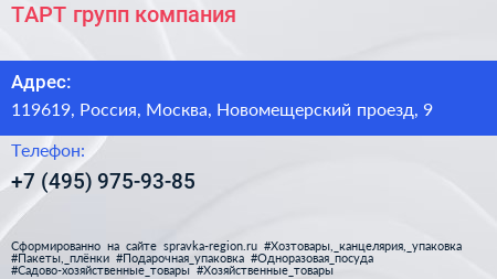 ТАРТ-групп, компания по адресу 119619, Россия, Москва, Новомещерский проезд, 9 в дальнейшем Организация, размещена в следующих категориях: