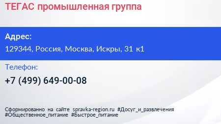 ТЕГАС, промышленная группа по адресу 129344, Россия, Москва, Искры, 31 к1 в дальнейшем Организация, размещена в следующих категориях: