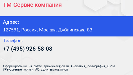 ТМ-Сервис, компания по адресу 127591, Россия, Москва, Дубнинская, 83 в дальнейшем Организация, размещена в следующих категориях: