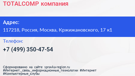 TOTALCOMP, компания по адресу 117218, Россия, Москва, Кржижановского, 17 к1 в дальнейшем Организация, размещена в следующих категориях: