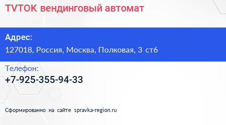 TVTOK, вендинговый автомат по адресу 127018, Россия, Москва, Полковая, 3 ст6 в дальнейшем Организация, размещена в следующих категориях: