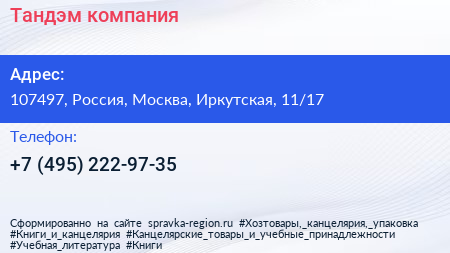 Тандэм, компания по адресу 107497, Россия, Москва, Иркутская, 11/17 в дальнейшем Организация, размещена в следующих категориях: