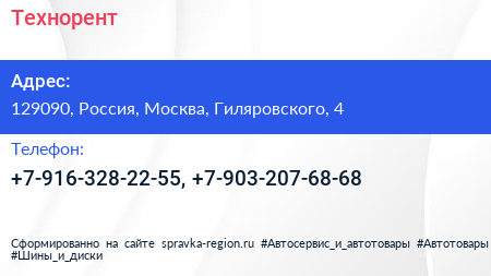 Технорент по адресу 129090, Россия, Москва, Гиляровского, 4 в дальнейшем Организация, размещена в следующих категориях: