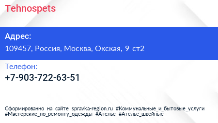 Tehnospets по адресу 109457, Россия, Москва, Окская, 9 ст2 в дальнейшем Организация, размещена в следующих категориях: