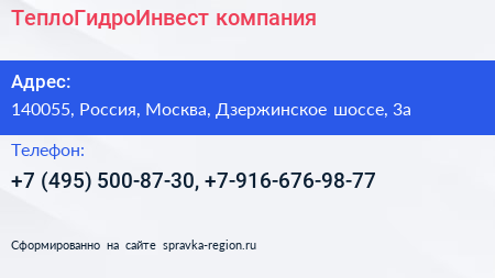 ТеплоГидроИнвест, компания по адресу 140055, Россия, Москва, Дзержинское шоссе, 3а в дальнейшем Организация, размещена в следующих категориях: