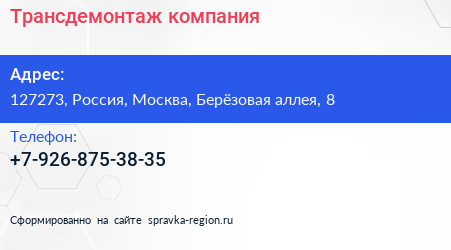 Трансдемонтаж, компания по адресу 127273, Россия, Москва, Берёзовая аллея, 8 в дальнейшем Организация, размещена в следующих категориях: