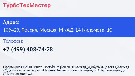 ТурбоТехМастер по адресу 109429, Россия, Москва, МКАД 14 Километр, 10 в дальнейшем Организация, размещена в следующих категориях: