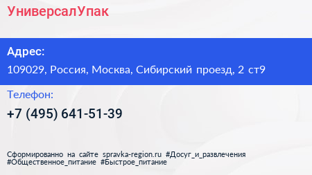 УниверсалУпак по адресу 109029, Россия, Москва, Сибирский проезд, 2 ст9 в дальнейшем Организация, размещена в следующих категориях: