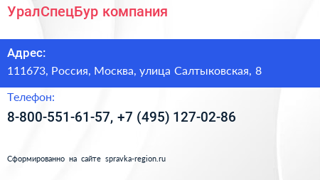 УралСпецБур, компания по адресу 111673, Россия, Москва, улица Салтыковская, 8 в дальнейшем Организация, размещена в следующих категориях: