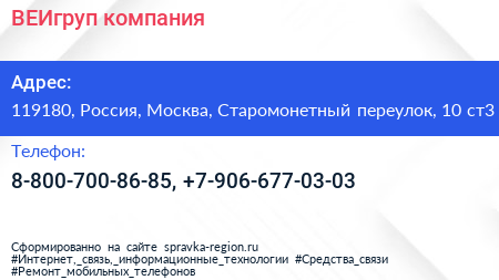 ВЕИгруп, компания по адресу 119180, Россия, Москва, Старомонетный переулок, 10 ст3 в дальнейшем Организация, размещена в следующих категориях: