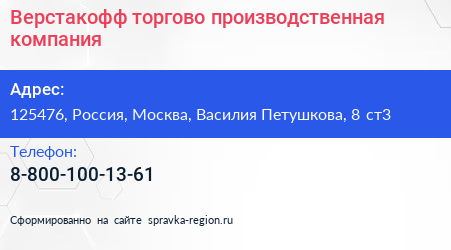 Верстакофф, торгово-производственная компания по адресу 125476, Россия, Москва, Василия Петушкова, 8 ст3 в дальнейшем Организация, размещена в следующих категориях: