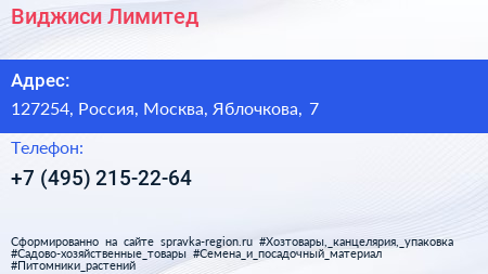 Виджиси Лимитед по адресу 127254, Россия, Москва, Яблочкова, 7 в дальнейшем Организация, размещена в следующих категориях: