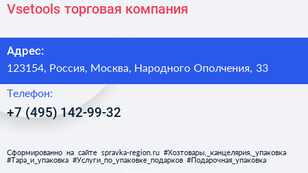 Vsetools, торговая компания по адресу 123154, Россия, Москва, Народного Ополчения, 33 в дальнейшем Организация, размещена в следующих категориях: