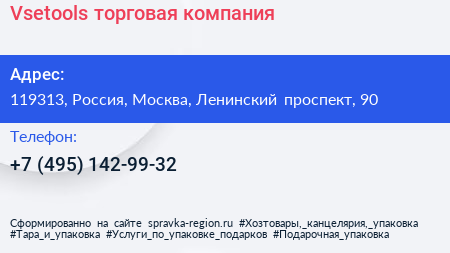 Vsetools, торговая компания по адресу 119313, Россия, Москва, Ленинский проспект, 90 в дальнейшем Организация, размещена в следующих категориях:
