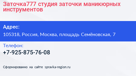 Заточка777, студия заточки маникюрных инструментов по адресу 105318, Россия, Москва, площадь Семёновская, 7 в дальнейшем Организация, размещена в следующих категориях: