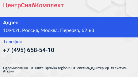 ЦентрСнабКомплект по адресу 109451, Россия, Москва, Перерва, 62 к3 в дальнейшем Организация, размещена в следующих категориях: