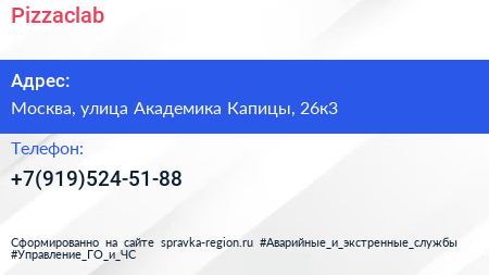 Pizzaclab по адресу Москва, улица Академика Капицы, 26к3 в дальнейшем Организация, размещена в следующих категориях: