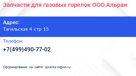 Запчасти для газовых горелок ООО «Альран» по адресу Тагильская 4 стр 15 в дальнейшем Организация, размещена в следующих категориях: