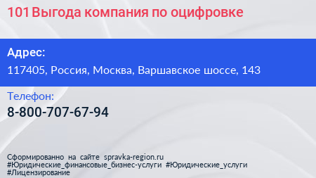 101 Выгода, компания по оцифровке по адресу 117405, Россия, Москва, Варшавское шоссе, 143 в дальнейшем Организация, размещена в следующих категориях: