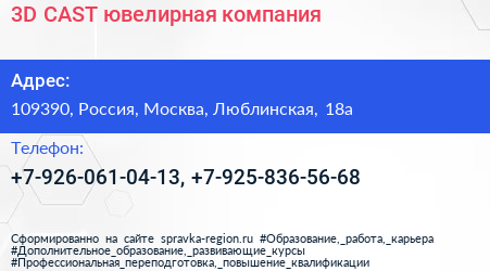 3D CAST, ювелирная компания по адресу 109390, Россия, Москва, Люблинская, 18а в дальнейшем Организация, размещена в следующих категориях: