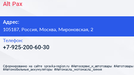 Alt Pax по адресу 105187, Россия, Москва, Мироновская, 2 в дальнейшем Организация, размещена в следующих категориях: