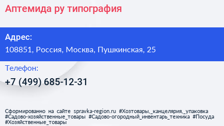 Аптемида.ру, типография по адресу 108851, Россия, Москва, Пушкинская, 25 в дальнейшем Организация, размещена в следующих категориях: