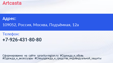 Artcasta по адресу 109052, Россия, Москва, Подъёмная, 12а в дальнейшем Организация, размещена в следующих категориях: