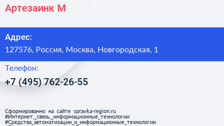 Артезаинк-М по адресу 127576, Россия, Москва, Новгородская, 1 в дальнейшем Организация, размещена в следующих категориях: