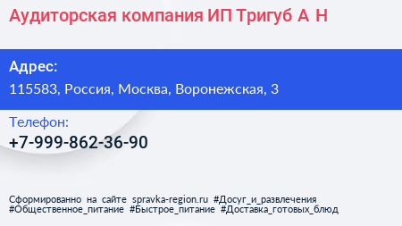 Аудиторская компания, ИП Тригуб А.Н. по адресу 115583, Россия, Москва, Воронежская, 3 в дальнейшем Организация, размещена в следующих категориях: