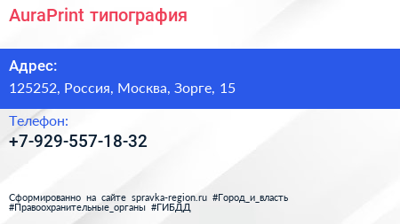 AuraPrint, типография по адресу 125252, Россия, Москва, Зорге, 15 в дальнейшем Организация, размещена в следующих категориях:
