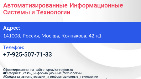 Автоматизированные Информационные Системы и Технологии по адресу 141008, Россия, Москва, Колпакова, 42 к1 в дальнейшем Организация, размещена в следующих категориях:
