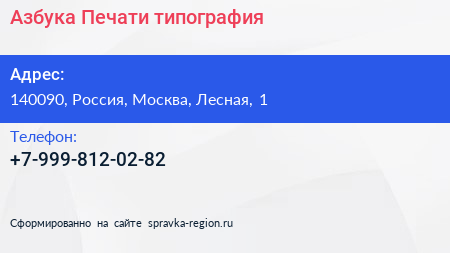 Азбука Печати, типография по адресу 140090, Россия, Москва, Лесная, 1 в дальнейшем Организация, размещена в следующих категориях:
