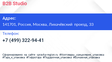 B2B Studio по адресу 141701, Россия, Москва, Лихачёвский проезд, 33 в дальнейшем Организация, размещена в следующих категориях: