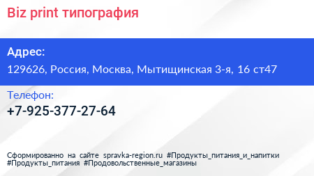 Biz-print, типография по адресу 129626, Россия, Москва, Мытищинская 3-я, 16 ст47 в дальнейшем Организация, размещена в следующих категориях: