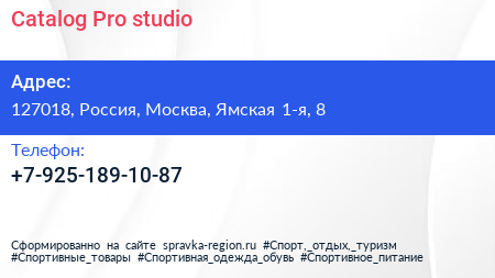 Catalog Pro studio по адресу 127018, Россия, Москва, Ямская 1-я, 8 в дальнейшем Организация, размещена в следующих категориях: