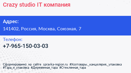 Crazy studio, IT-компания по адресу 141402, Россия, Москва, Союзная, 7 в дальнейшем Организация, размещена в следующих категориях:
