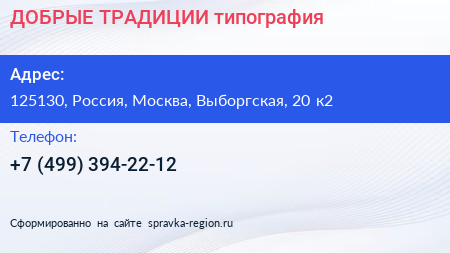 ДОБРЫЕ ТРАДИЦИИ, типография по адресу 125130, Россия, Москва, Выборгская, 20 к2 в дальнейшем Организация, размещена в следующих категориях: