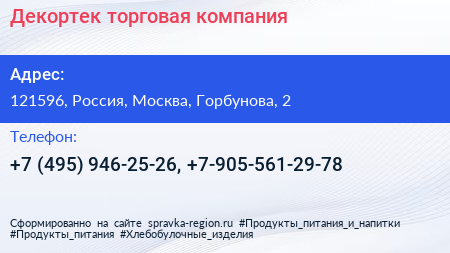 Декортек, торговая компания по адресу 121596, Россия, Москва, Горбунова, 2 в дальнейшем Организация, размещена в следующих категориях: